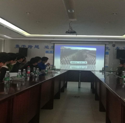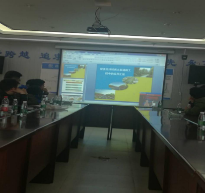 現(xiàn)場聽取介紹昌九快速路工程概況以及目前的施工技術(shù)特點、難點及進展情況;現(xiàn)場觀看了從泡沫混泥土施工工藝、大型橋梁的梁片、張拉、運輸、架梁等方面的效果視頻及深入細(xì)致的講解,工程的體量和技術(shù)難度讓人震撼。大家在認(rèn)真觀看視頻后,不時地提出問題請教,項目總監(jiān)都一一進行了解答。