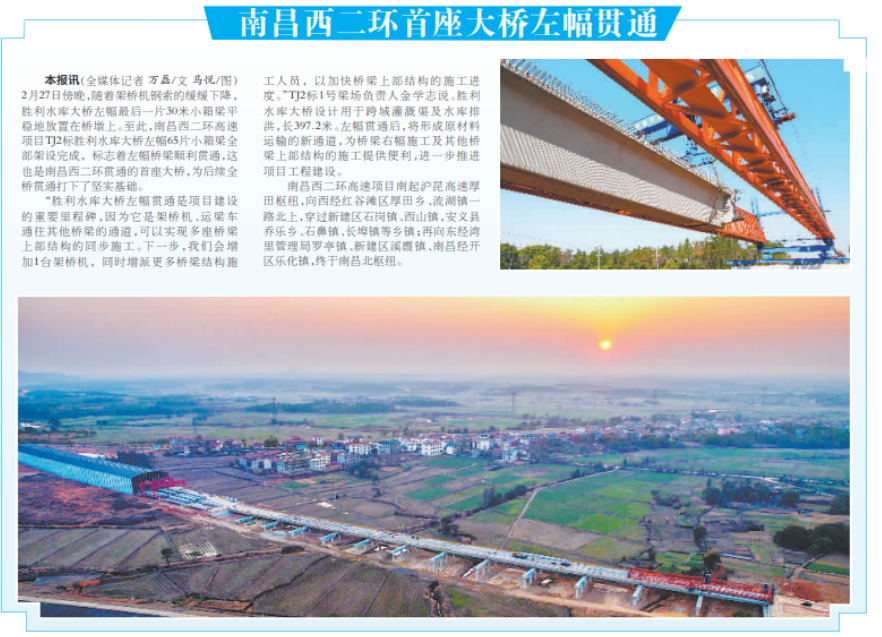 2月27日傍晚,隨著架橋機(jī)鋼索的緩緩下降,勝利水庫大橋左幅最后一片30米小箱梁平穩(wěn)地放置在橋墩上。至此,南昌西二環(huán)高速項(xiàng)目TJ2標(biāo)勝利水庫大橋左幅65片小箱梁全部架設(shè)完成,標(biāo)志著左幅橋梁順利貫通,這也是南昌西二環(huán)貫通的首座大橋,為后續(xù)全橋貫通打下了堅(jiān)實(shí)基礎(chǔ)。