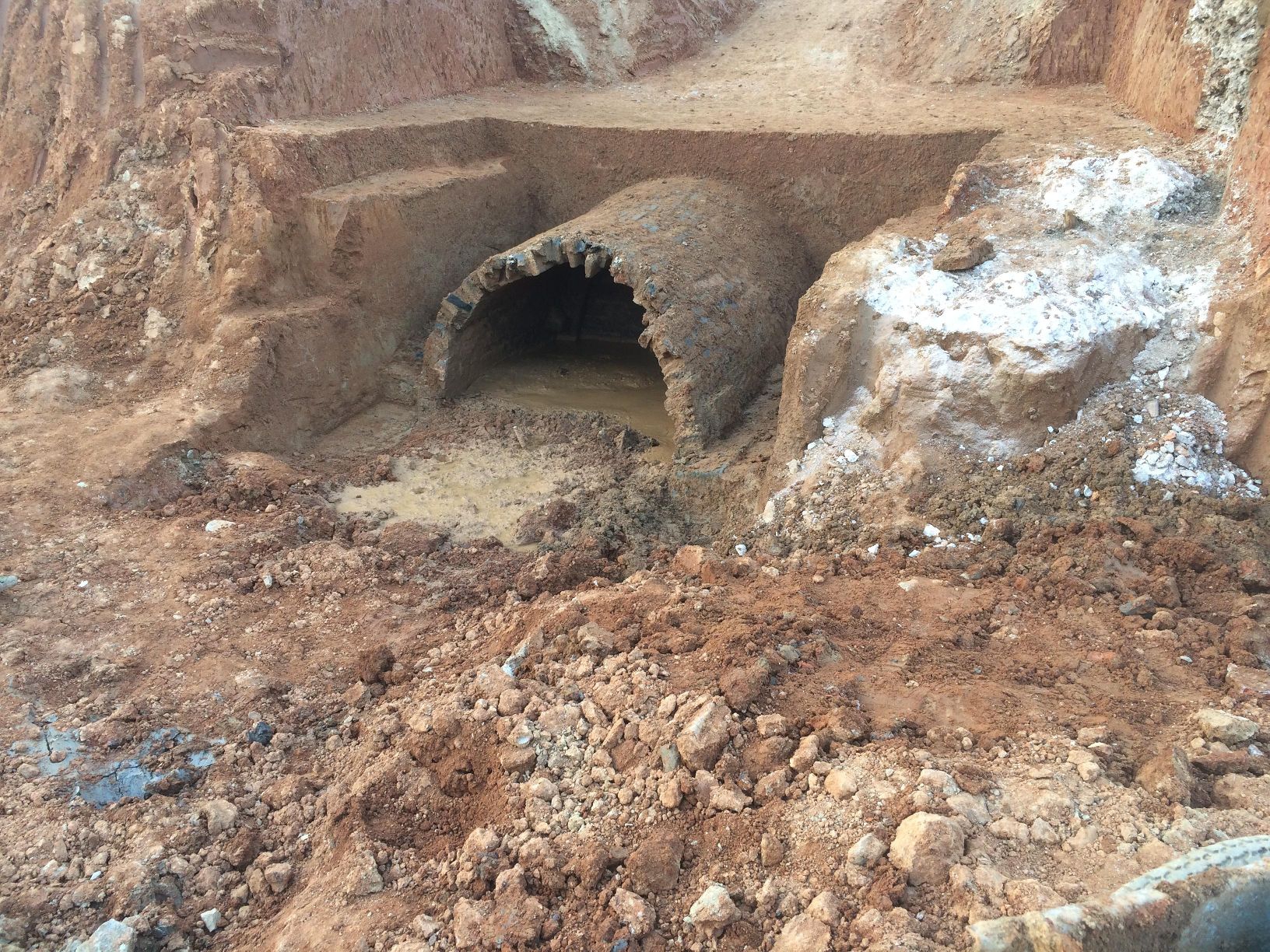 古墓是在進(jìn)行1#地下室土方開挖作業(yè)時發(fā)現(xiàn)的,中鐵二十局集團有限公司施工人員在使用反鏟挖掘機開挖1#地下室第二層土方時鏟斗破開了古墓的拱頂,古墓內(nèi)部流出了大量的積水,但因頂部構(gòu)造相似,當(dāng)時未能確定是古墓還是舊人防設(shè)施。